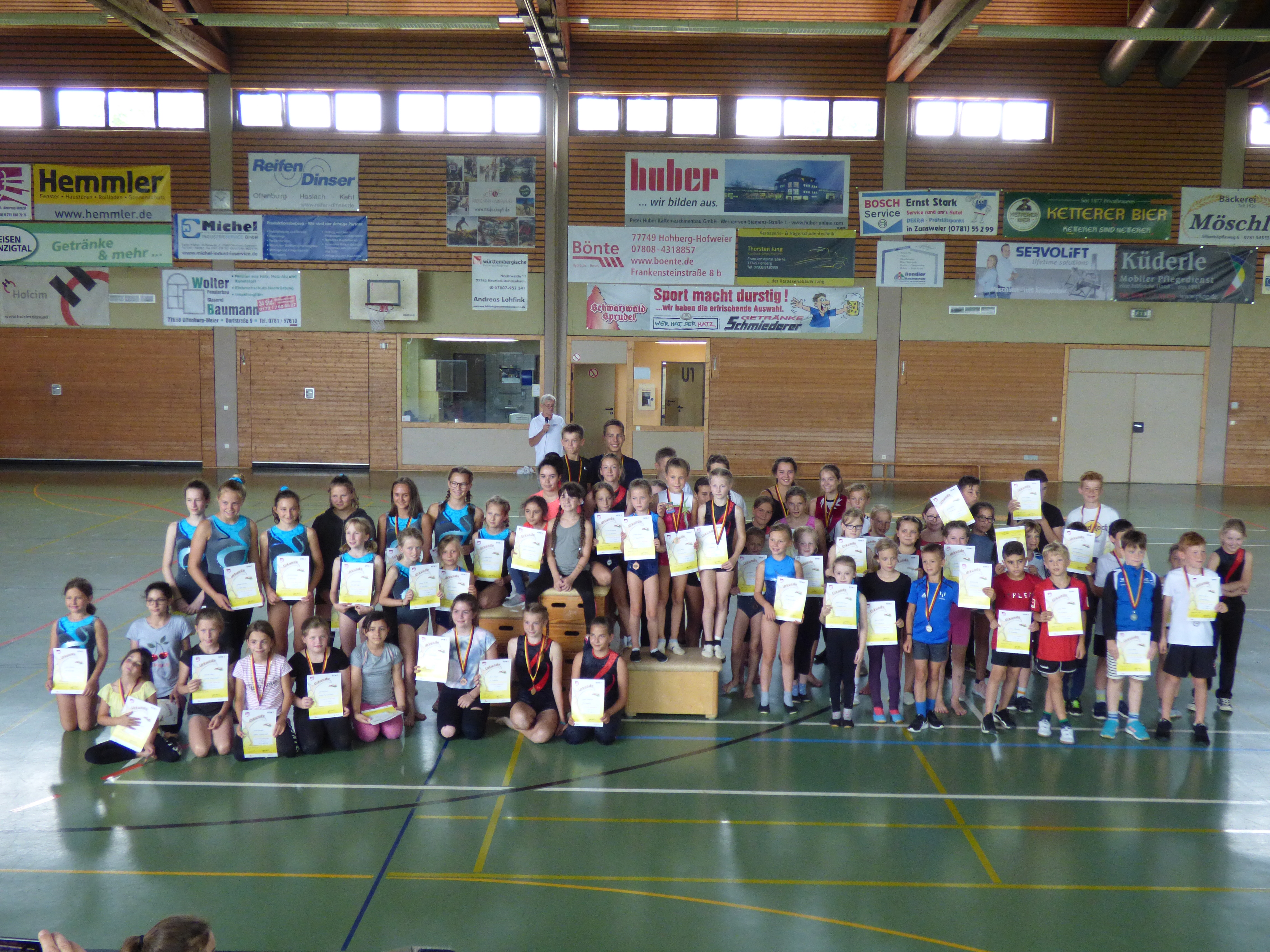 Schon gegen 8.30 Uhr trafen am Sonntag, den 14. Juli die ersten Turnerinnen und Turner an der Sporthalle Zunsweier ein. Sie fanden sehr gute Wettkampfbedingungen vor. Nach Übungen zur Erwärmung und dem Einturnen startete der Wettkampf um 10 Uhr. Udo Kraus, Koordinator für Turn10® in der Ortenau begrüßte alle Anwesenden sehr herzlich. Die Teilnehmer stellten sich in Riegen aus ihren jeweiligen Vereinen den verschiedenen Wettkämpfen. Mit viel Freude und Ehrgeiz wurde geturnt, gerannt und gesprungen. Es gab tolle Sprünge am Trampolin zu sehen. Hier wurde sogar einmal die Traumnote 20,0 (höchstmögliche Punktzahl im Turn10®-Programm) vergeben. Alle strengten sich an ihre Boden-Übungen bestmöglich vorzuführen. Auch die Schwünge und Drehungen am Reck zeigten alle Beteiligten mit viel Einsatz. Besonders schnell ging es beim 18m-Umkehrlauf zu, auch beim Speed Rope Skipping mussten die Kampfrichterinnen sehr schnell zählen und viele Turnerinnen und Turner erreichten hohe Punktzahlen! Zur abschließenden Siegerehrung durften alle Wettkampfteilnehmer stolz ihre Urkunde in Empfang nehmen. Die Plätze auf dem Treppchen wurden mit Medaillen geehrt. Außerdem freuten sich alle Kinder über den Griff in den großen Korb mit Süßigkeiten, den ihnen Leonie Luis, Multiplikatorin für Turn10® in der Ortenau, entgegenhielt.