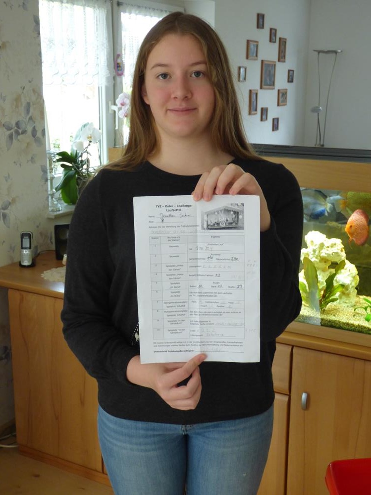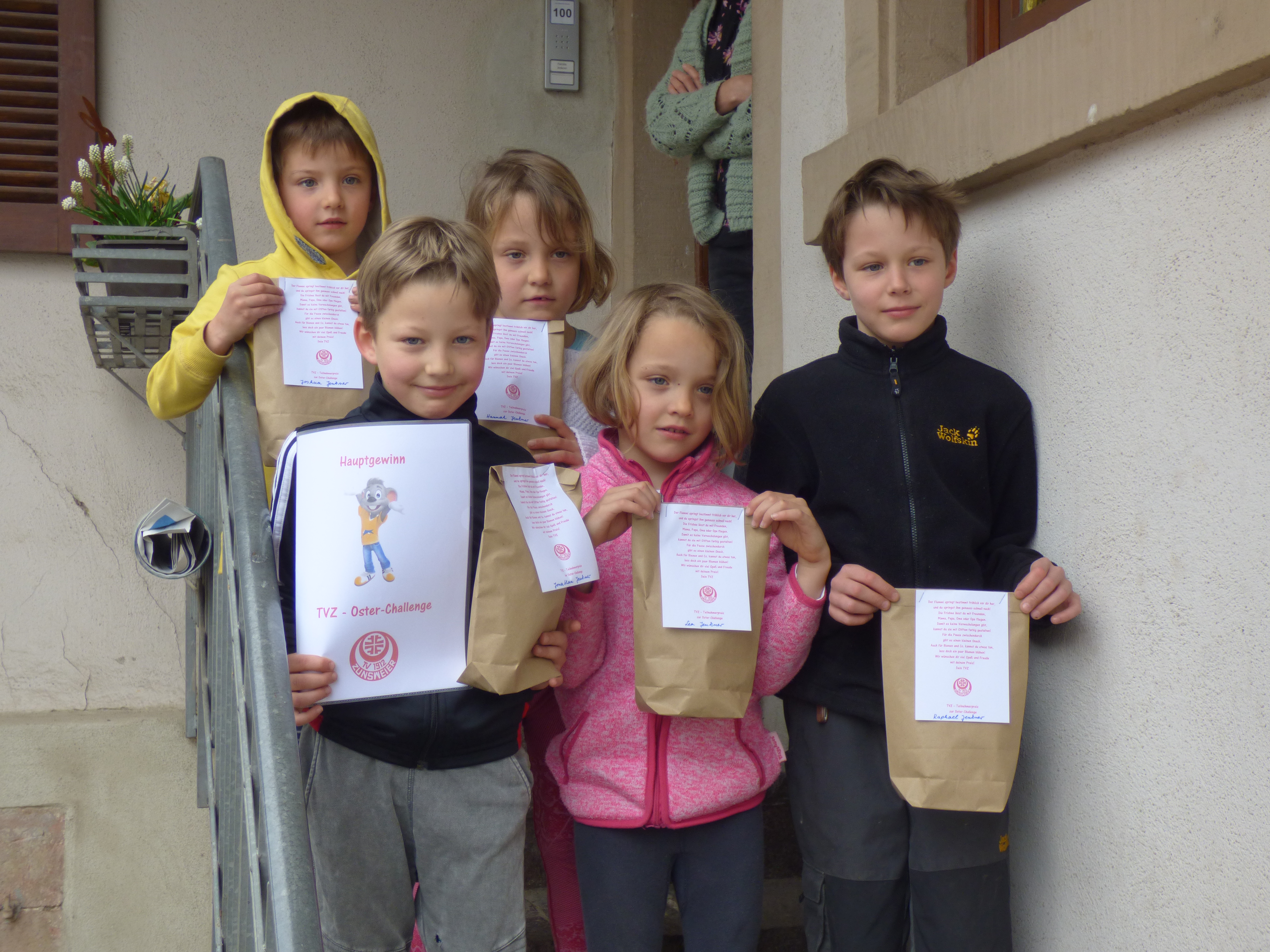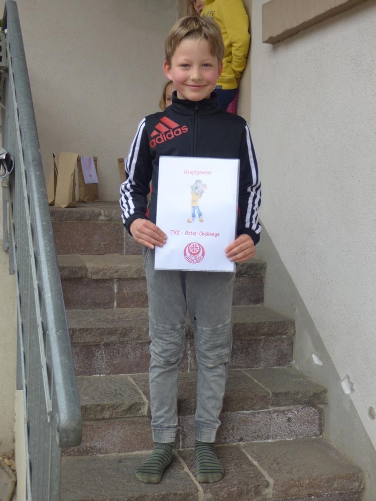 Nachdem nun 46 Kinder erfolgreich an der TVZ-Oster-Challenge teilgenommen hatten, wurde mit großer Spannung die Verlosung des Hauptpreises erwartet. Am 18. April war es dann soweit. Nachdem für alle Teilnehmer ein Teilnehmerpreis gerichtet war, zog Lisa Höfer aus allen in den TVZ Osterbriefkasten geworfenen Laufzetteln die GewinnerIn. Die Verlosung kann man auch als kleinen Film auf unserer Homepage anschauen. Den Hauptpreis, eine Eintrittskarte für den Europapark, hat Jonathan Jenkner gewonnen. Der Hauptpreis wurde dem glücklichen Gewinner übergeben, da war die Freude groß! Im Laufe dieser Woche wurden auch die Teilnehmerpreise verteilt. So wie Jonathan und seine Geschwister freuen sich nun alle über einen schönen Flummi und eine Frisbee, die man selbst bemalen kann. Als kleine Stärkung gab es noch einen Müsliriegel. Außerdem enthielten alle Teilnehmerpreise ein Sammentütchen, dadurch können viele schöne Blumen wachsen, die Nahrung für Insekten bieten. Als Erinnerung wurde für jedes Kind noch eine Urkunde zur TVZ-Oster-Challenge erstellt.