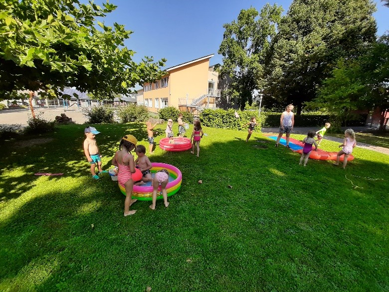Für die Kindergarten- und Schulkinder gab es am Freitag, den 3. September noch ein besonderes Highlight. Das Wetter spielte mit und wir vergnügten uns bei strahlendem Sonnenschein auf dem Mehrgenerationenplatz mit viel Wasser. Planschbecken, Wasserhüpfspiel, Wasserrutsche und Wasserbomben sorgten für viel nasses Vergnügen.