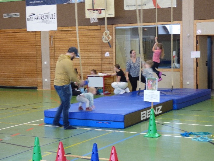 Über einhundert Kinder hatten viel Spaß in der Halle und auch unsere Kletterwand war immer belegt. Sich hochziehen, klettern und die Welt von oben sehen faszinierte viele Kinde und auch Erwachsene. Der Spaß beim Klettern liegt im Austesten der eigenen Möglichkeiten, denn es gibt immer noch eine schwierigere Route an der Wand. Es gilt, Geschicklichkeit, Kraft und Beweglichkeit gut einzusetzen. Klettern ist ein Sport in der Gruppe, Kopf und Körper müssen gut miteinander harmonieren, dabei wird die Koordinationsfähigkeit geschult. Schon bei wöchentlichem Training gelangt man schnell zu tollen Erfolgserlebnissen. Der Klettersport ist für die ganze Familie geeignet, gern leiten wir die Eltern dabei an, ihre Kinder zu sichern. In unseren regulären Trainingsgruppen kann man jeden Freitag das Klettern ausprobieren. Ab 19 Uhr freuen wir uns auf kletterbegeisterte Kinder, die ihre Eltern mitbringen, damit sie das Sichern übernehmen. Unsere ausgebildeten Übungsleiter unterstützen sie beim Erlernen der Sicherungstechnik. Ab 20.30 Uhr sind Jugendliche ab Klasse 9 und Erwachsene herzlich in unserer Klettergruppe willkommen. Auch hier sind fachkundige Übungsleiter vor Ort um beim Klettern und Sichern mit hilfreichen Tipps zur Seite zu stehen.