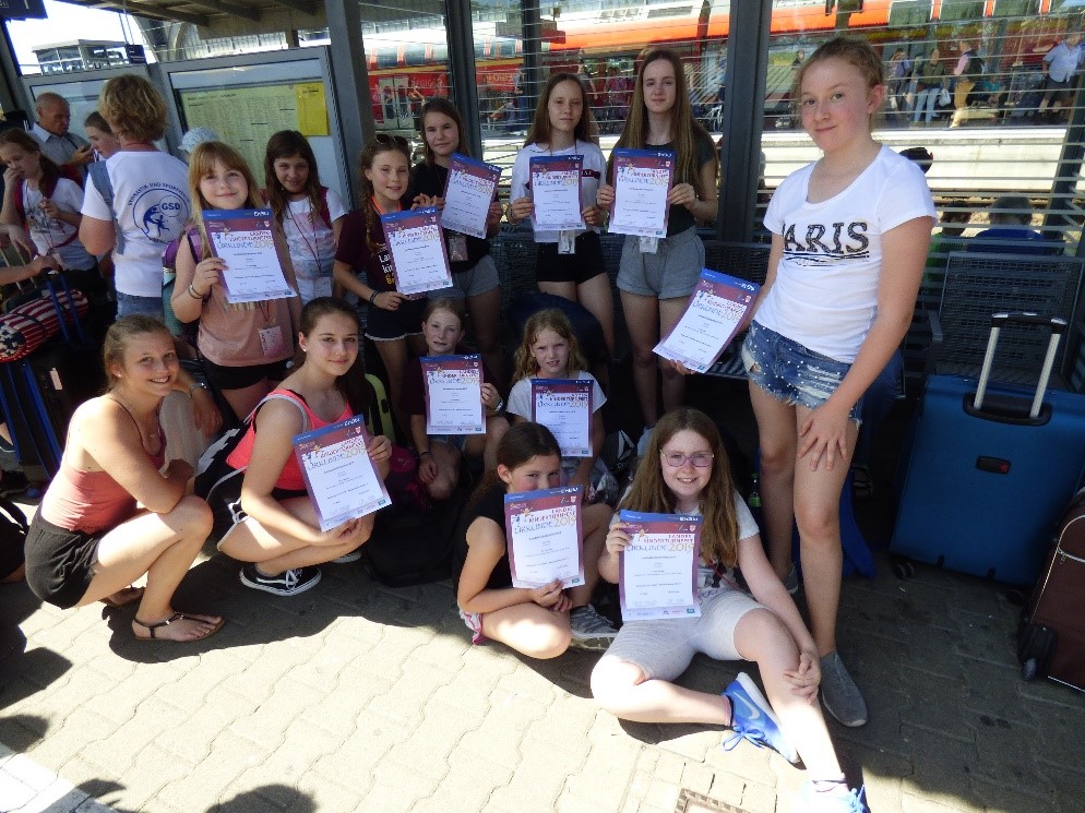 Am Sonntagmorgen wurden dann die Taschen gepackt und aufgrund des heißen Wetters genossen wir die verbleibenden Stunden im Freibad Bruchsal. Gegen Mittag machten wir uns dann auf den Weg zum Bahnhof. Dabei konnten dann auch die Urkunden an die erfolgreichen Turnerinnen verteilt werden.